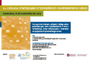 Divendres, 16 de novembre de 2012 a la tarda, va tenir lloc la 4a Jornada d’Intercanvi d’Experiències d’Aprenentatge Servei a l’Espai Jove La Fontana, al carrer Gran de Gràcia, 190 de Barcelona. La Jornada pretenia augmentar el bagatge dels participants a partir de la reflexió sobre aspectes que incideixen en l’encaix educatiu i social […]