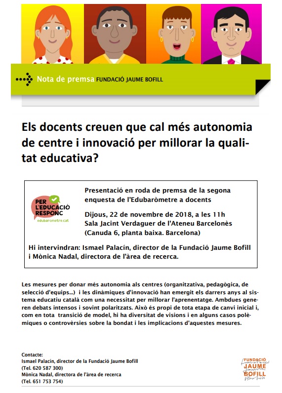 Presentació en roda de premsa de la primera enquesta de l’Edubaròmetre. Dijous, 1 de març de 2018, a les 11 h: Sala Jacint Verdaguer de l’Ateneu Barcelonès, (Canuda 6, planta baixa. Barcelona) Hi intervindran: Ismael Palacín, director de la Fundació Jaume Bofill i Mònica Nadal, directora de l’àrea de recerca. edubarometre.cat, Per […]