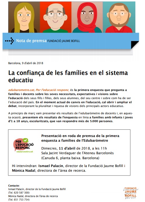 Presentació en roda de premsa de la segona enquesta a famílies de l’Edubaròmetre La nota de premsa sencera aquí. Dimecres, 17 d’octubre de 2018, a les 11h. Sala Jacint Verdaguer de l’Ateneu Barcelonès. (Canuda 6, planta baixa. Barcelona) Hi intervindran: Ismael Palacín, director de la Fundació Jaume Bofill i Mònica Nadal, directora de l’àrea de recerca. […]