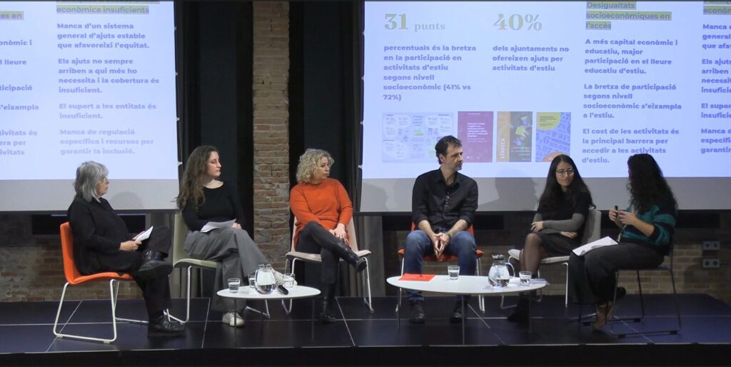 Núria Sala: I també perquè sovint pressuposem moltes coses: que tothom entendrà què és el lleure educatiu, que tothom valorarà els beneficis de la mateixa manera, que tothom se sentirà còmode amb els codis… En un context de diversitat i desigualtat estructural, moltes desigualtats no es fan evidents a simple vista, sinó que es manifesten en aspectes quotidians. Aquí és important fer el pas de pensar només en el context familiar, o en l’accés, a pensar també en els nens, les nenes i adolescents. Perquè fins i tot quan s’han superat barreres, cal mirar com aquests eixos de desigualtat condicionen l’experiència dins l’espai: quin lloc ocupes, com et vincules o com et sents reconegut.