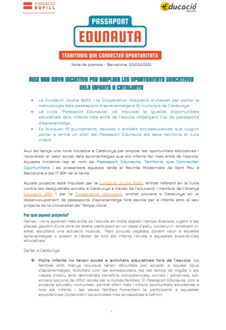 Passaport Edunauta: Neix una nova iniciativa per ampliar les oportunitats educatives dels infants a Catalunya