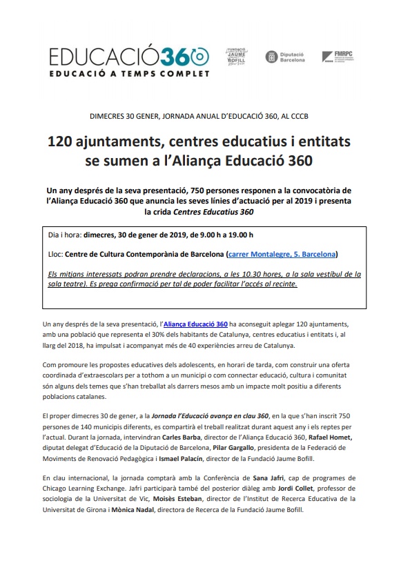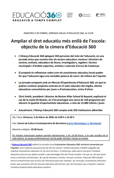 Convocatòria de roda de premsa. Dia i hora: dilluns, 29 de gener de 2018 a les 10.15 h / Lloc: Sala 1 CCCB (Centre de Cultura Contemporània de Barcelona) / (Montalegre, 5. Barcelona) Neix l’aliança EDUCACIÓ360 perquè el model educatiu a Catalunya promogui i integri les oportunitats educatives extraescolars i comunitàries, i en garanteixi l’equitat en el […]