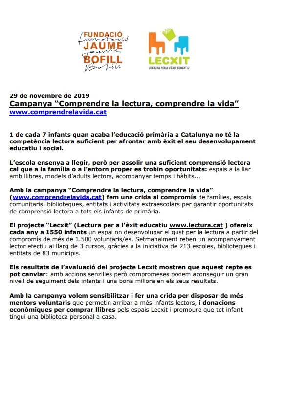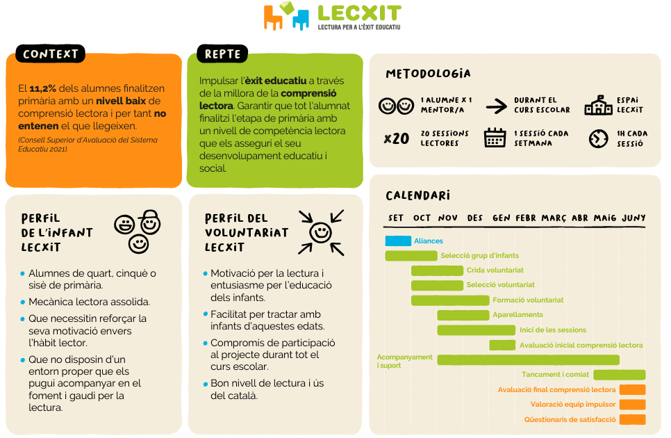 LECXIT és un dels programes més veterans de la Fundació Bofill, amb més de 12 anys de recorregut. El programa té per objectiu incrementar l'èxit educatiu a través del gust per a lectura i la millora de la comprensió dels infants que no tenen un hàbit lector consolidat i no disposen d'un acompanyament lector des del seu entorn proper.