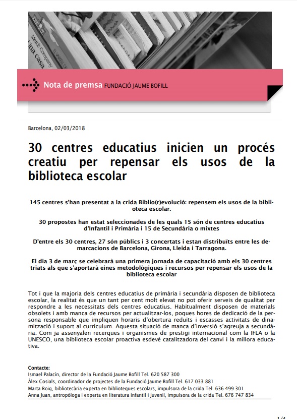 La crida Biblio(r)evolució, repensem els usos de la biblioteca escolar ha fet pública la llista definitiva dels 30 centres que participaran en el procés de cocreació de nous usos de la biblioteca escolar. La crida a la participació ha estat un èxit i un total de 145 centres educatius van presentar propostes, totes elles interessants i d’alt valor.