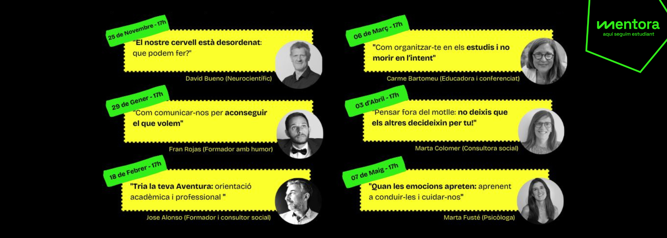 El programa Mentora impulsa un cicle de tallers adreçats a l’alumnat de Batxillerat i cicles formatius de Grau Mitjà. Aquestes converses pràctiques, impartides per experts en diferents àmbits, abordaran temes d’interès per als joves com la motivació, la presa de decisions, la comunicació assertiva, l’orientació acadèmica i professional o el pensament crític, i es podran seguir de forma online.