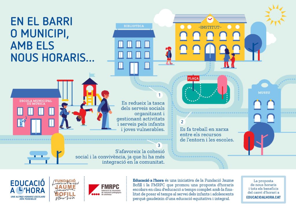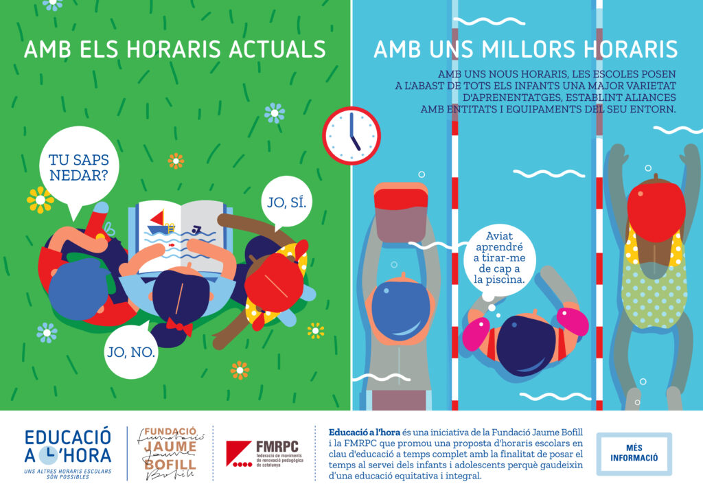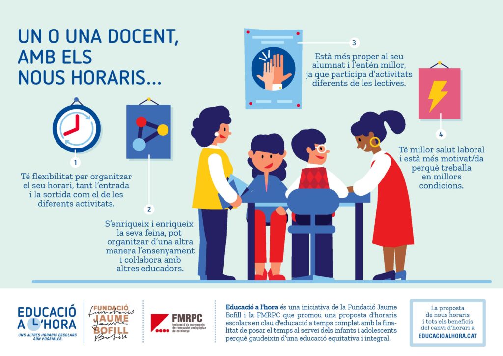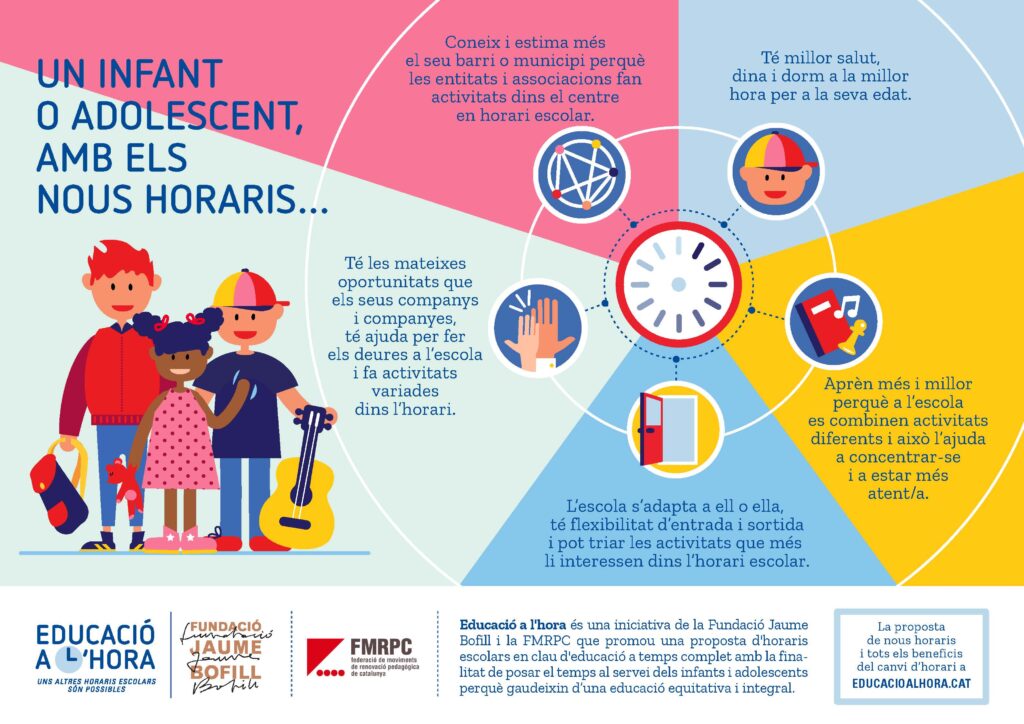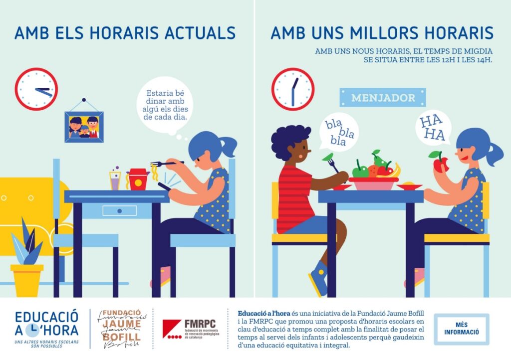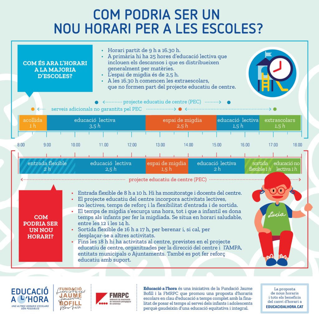 A la jornada Posem l’educació a l’hora! vam conèixer algunes experiències de centres que estan fent horaris diferents, centres que s’han replantejat els horaris per diverses raons i han introduït canvis tant en les entrades i les sortides o la pausa de migdia com en les activitats que fan en horari escolar.