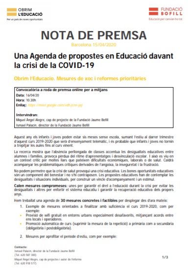 Una Agenda de propostes en Educació davant la crisi de la COVID-19