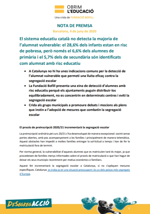 El període de preinscripció, que serà principalment online, i una alta mobilitat de les famílies a causa de la crisi de la COVID-19, empitjoraran els nivells de segregació escolar a Catalunya El Departament d’Educació ha d’establir urgentment criteris clars i homogenis per detectar i distribuir l’alumnat vulnerable si vol evitar un increment de […]