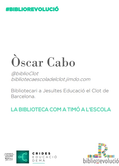 Oscar Cabo Mosteiro és historiador de l’art, músic i treballa des de fa set anys a Jesuïtes Educació el Clot, a la biblioteca de l’escola. Creu en l’educació i ha estat vinculat des de nen al món de la educació en el lleure. Ara mateix està cursant el Màster en Literatura Juvenil i Infantil (LIJ), per especialitzar-se i per seguir donant dinamització a la lectura en el seu centre. Creuen no tan sols des de la biblioteca, sinó també des del centre educatiu, en la tasca clau que pot fer la biblioteca, tant a nivell curricular com a nucli social per a infants i joves, famílies i professorat.