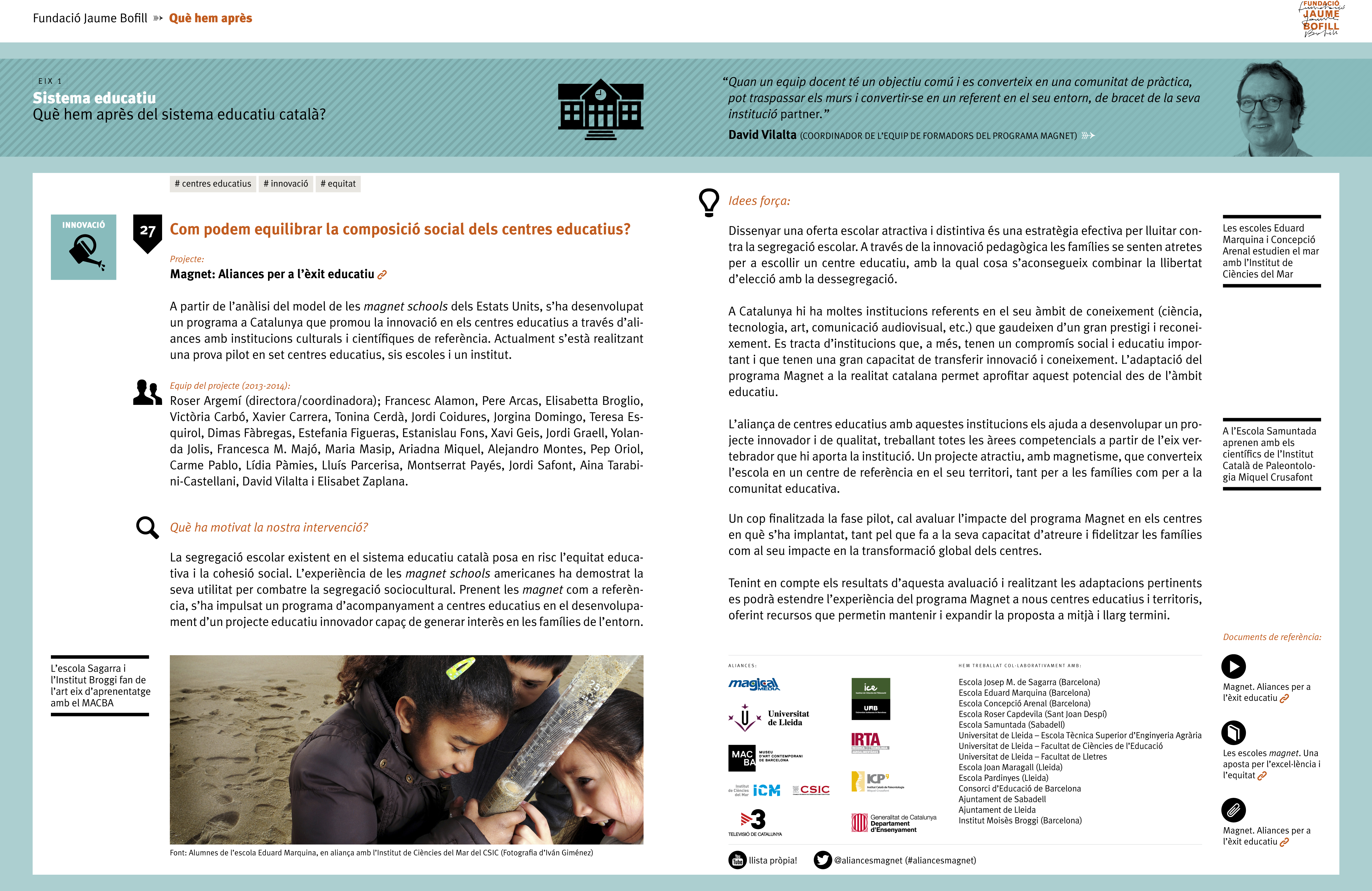 A partir de l’anàlisi del model de les magnet schools dels Estats Units, s’ha desenvolupat un programa a Catalunya que promou la innovació en els centres educatius a través d’aliances amb institucions culturals i científiques de referència. Actualment s’està realitzant una prova pilot en set centres educatius, sis escoles i un institut.